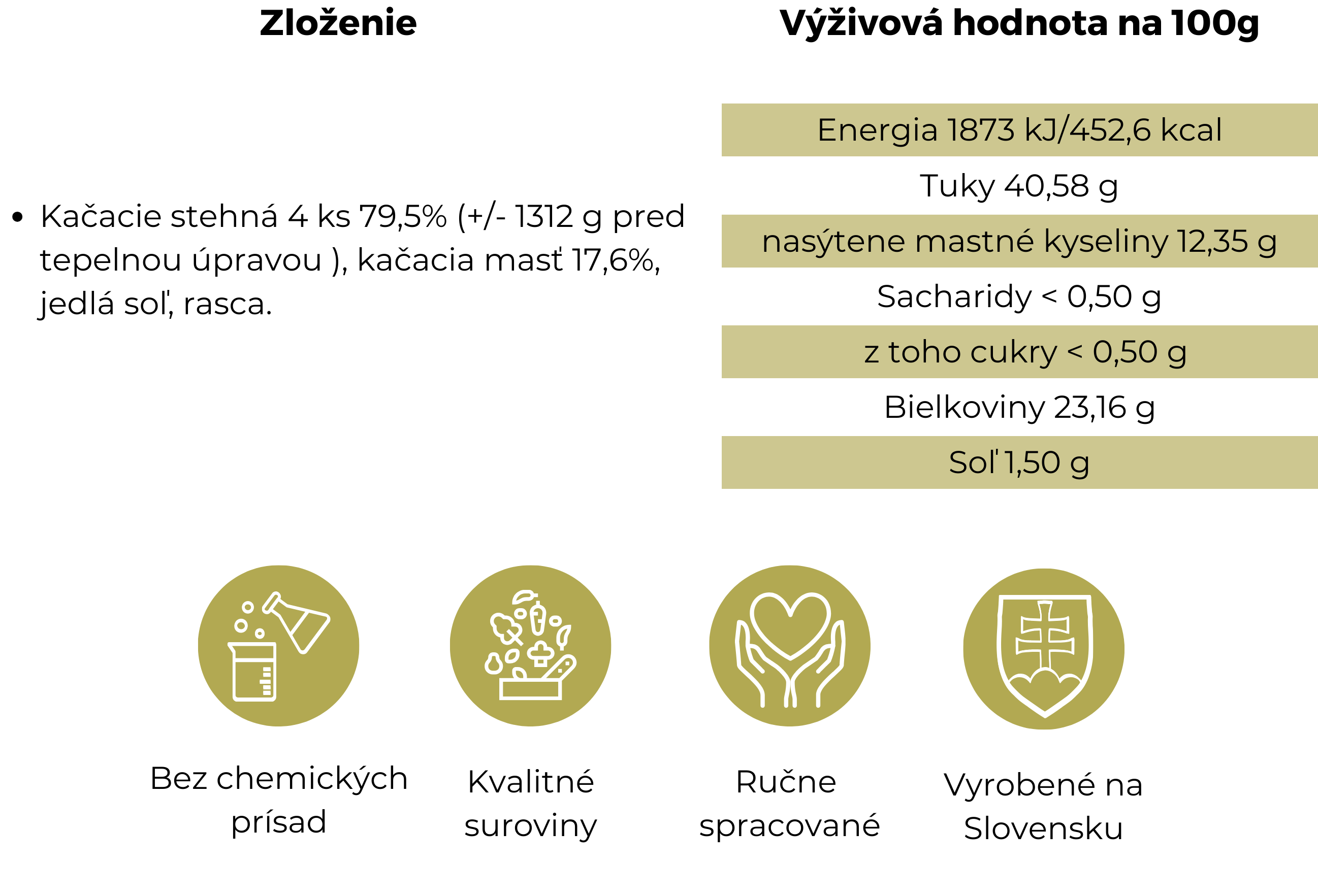Pripravili sme si pre Vás kačacie stehná v konzerve - kulinársky pôžitok, ktorý zalahodí vaším chuťovým pohárikom. Tieto jemné a šťavnaté kačacie stehná sú konfitované a zaliaté v kačacom tuku, výsledkom čoho je bohatá a príjemná chuť. Netreba tráviť hodiny v kuchyni prípravou kačice od začiatku. Jednoducho otvorte plechovku, zohrejte kačacie stehná a za pár minút si vychutnajte jedlo hodné reštaurácie.